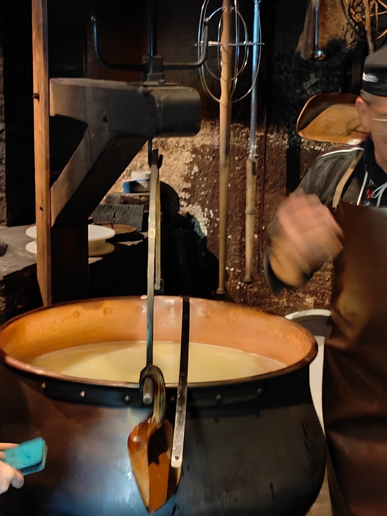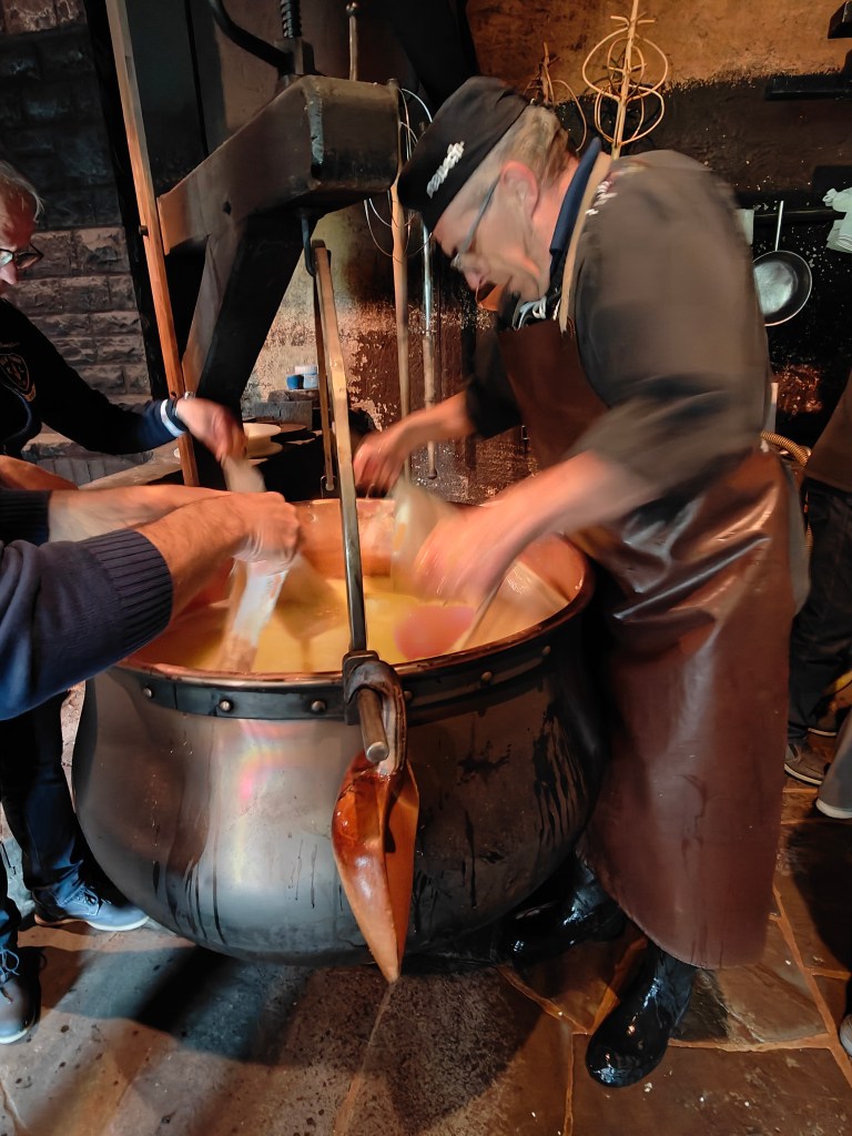 Ensuite, on ajoute la présure, et les outils de brassage sont remplacés par les outils de coupe (harpes). La présure est une enzyme qui fait cailler le lait et le transforme en une masse gélatineuse semi-solide. C’est la condition préalable pour séparer la masse solide du fromage du lactosérum liquide. Après l’ajout de la présure, le lait doit reposer. Au bout de 40 minutes, le lait a caillé et ressemble à du yaourt compact.