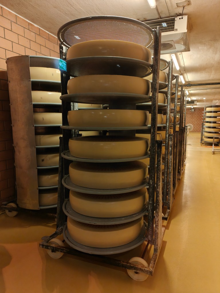 Au bout de six à huit semaines, dès que les trous ont atteint la bonne taille, les meules de fromage sont placées en cave de stockage à environ 12 °C. La formation des trous est stoppée et le fromage peut poursuivre son affinage.